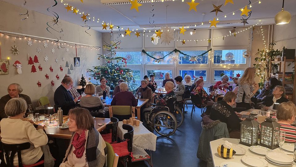 Unser Chor sorgte anschließend mit drei stimmungsvollen Weihnachtsliedern für eine feierliche Einstimmung, bei denen viele Gäste begeistert mitsangen. Danach hatten Gisela, Sabine und Valentyna – unsere Ehrenamtlichen aus dem Freitagscafé – bereits das Mittagessen vorbereitet. Kassler mit Salat stand für alle bereit und wurde mit großem Appetit genossen.