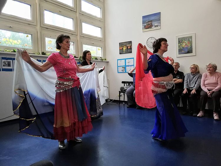 Das Ganze geschieht bei Klängen orientalischer Musik und Weltmusik, die die Tanzschritte gut unterstützen. Hin und wieder lernen wir auch leichte Folkloretänze. So wird auch schon mal ein griechischer Kreistanz eingeübt.